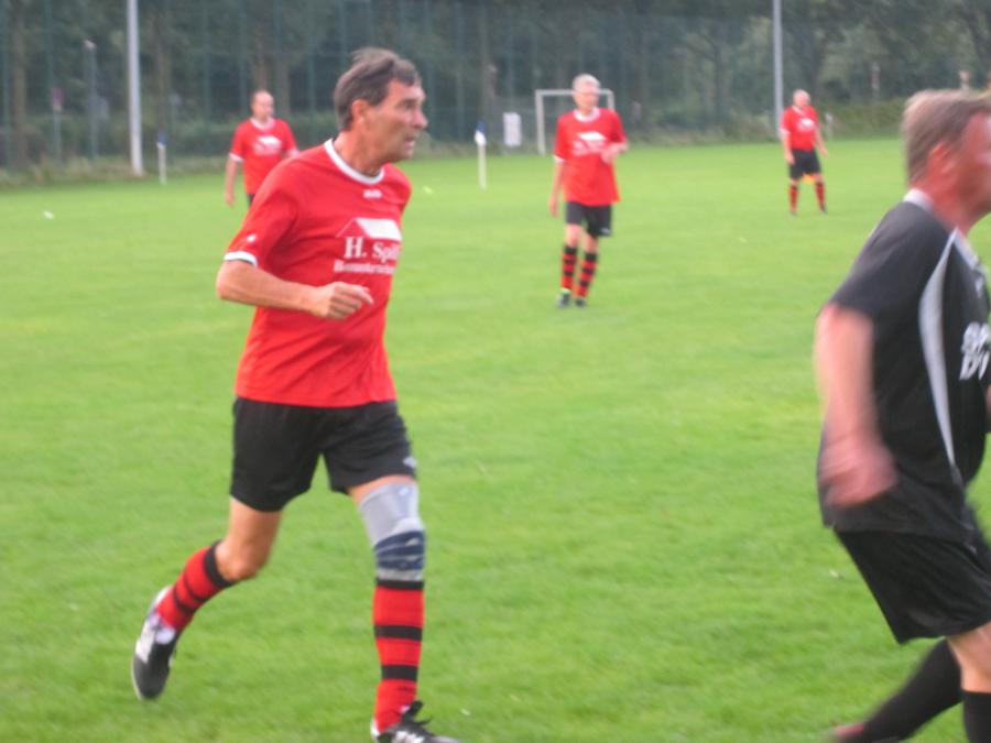 Diese Anweisungen wurden nur bedingt eingehalten. In der 31. Minute startete Rainer Dicke zu einem Sololauf, verstolperte aber vorm Tor den Ball, wäre ansonsten frei und allein vorm Torwart gewesen. Bodo Behrens tauchte auch allein vorm PSV-Keeper auf (37.), der klärte dann mit einer Fußabwehr (die bis dahin größte Litteler Chance). Und auch Wolfgang Wellmann erspielte sich eine gute Situation (41.), seine Hereingabe fand aber keinen Abnehmer. Mittlerweile war das Spiel etwas hektischer geworden. Kleinere Nickligkeiten hatten sich eingeschlichen, viele Aktionen wurden mehr oder weniger lautstark kommentiert. Der Schiedsrichter hatte seine Souveränität verloren und traf zum Teil etwas merkwürdige Entscheidungen. So erhielt Bodo Behrens die gelbe Karte, obwohl es die bei der Ü48 gar nicht gibt, stattdessen muss es eine 5-Minuten-Strafe geben. In der 48. Minute ging die Heimmannschaft in Führung. Eine vermutlich als Flanke gedachte hohe Hereingabe von links flutschte unserm Torwart durch die Hände (der Ball war mittlerweile auch nass und rutschig), flog über Henning Gerdes hinweg an den Pfosten und trudelte von da ins Netz. Kurz danach gab es auch für den PSV eine gelbe Karte (s. o.). Die Motzerei und kleinen Fouls gingen weiter. Aber die Litteler kämpften und erspielten sich einige Möglichkeiten. So hielt der Torwart einen Ball von Bodo Behrens (56.), faustete einen Eckball von Mario Bein aus die Gefahrenzone (57.). Und dann fiel auch der verdiente Ausgleichstreffer 58.). Mario Bein zog in Robben-Manier von außen in die Mitte und zog aus 15m ab. Der Ball schlug flach und wuchtig im Tor ein, war für den Keeper nicht zu halten – der streckte sich vergeblich. Thorsten Göken erhielt dann Sekunden vor dem Abpfiff auch noch „gelb“.