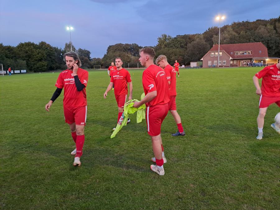 Gleich nach der Pause hatte der SFL wieder eine Chance, Einen Freistoß von Maik Schröder konnte der TVD-Keeper Patrick Stefan nicht richtig wegfauasten, der Ball kam zu Felix Jäger, der am langen Pfosten stehend aber drüber schoss. Unsere Erste war jetzt spielbesimmend. In der 55.Minute musste die Abwehr allerdings einen Schuss von Andrej Kari mit vereinten Kräften blocken. Das Spiel war weiterhin fair, auch daran zu erkennen, dass beide Mannschaften Entscheidungen des Schiedsrichters bezüglich Ecken korrigierten. In der 68.Minute gab es eine sehenswerte Kombination von Hannes Siemer zu Felix Jäger und weiter auf Christian Schuler, dessen Torschuss aber geblockt werden konnte. Trainer Büsing forderte seine Spieler auf: “Müssen mehr tun, auch wenn es weh tut!“ Und der ständige Druck der Litteler und das hohe Tempo im bisherigen Spiel forderte von seinen Spielern Tribut. Immer wieder lagen seine Spieler auf dem Boden, häufig von Krämpfen geplagt. So mussten allein 3 Dötlinger mit Muskelkrämpfen ausgetauscht werden! In der 87.Minute vergab Finn Lüschen-Strudthoff die letzte Möglichkeit in der regulären Spielzeit. Für den TVD ergaben sich jetzt vereinzelt Gelegenheiten, da der SFL die Abwehr gelockert hatte. So war Innenverteidiger Kevin Niemann in den Sturm beordert worden. Schiedsrichter Jörn zeigte eine (krämpfebedingte) Nachspielzeit von 8 Minuten an. In der ersten Minute der Nachspielzeit traf Maik Schröder die Latte! In der 90.+6. Minute wurde es noch mal hektisch. Der gerade eingewechselte Dekurim Stubla streckte mit einem Ellenbogenschlag ins Gesicht Felix Jäger an der Strafraumgrenze nieder (war damit nicht mal 1 Minute auf dem Platz gewesen). Den anschließenden Freistoß setzte Maik Schröder an die Unterkante der Latte, der Ball landete hinter der Torlinie, sprang von da aber wieder raus. SR Peters ließ weiterspielen, obwohl er gut gestanden hatte und gesehen haben müsste, dass der Ball im Tor war. Alle Proteste der Litteler halfen nicht. Dann ertönte auch schon der Schlusspfiff.